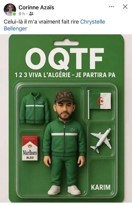 L’image représente la figurine d’un homme s’appelant Karim, vêtu d’une tunique tout en vert avec une bande blanche. Le Starter packs, intitulé OQTF, comporte aussi un avion et un drapeau algérien, avec un sous-titre qui mentionne « 1 2 3 Viva l’Algérie-je partira pa ».